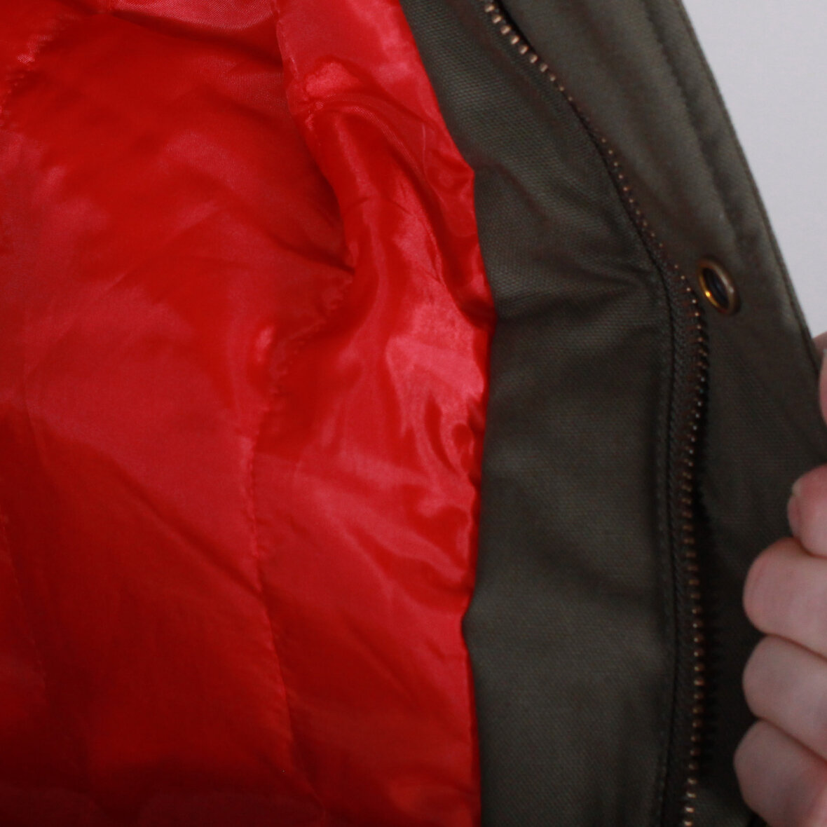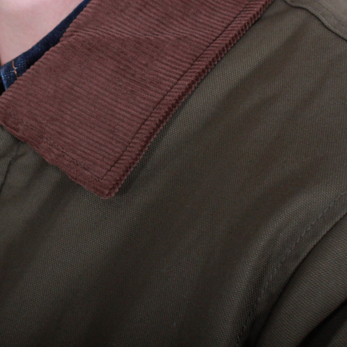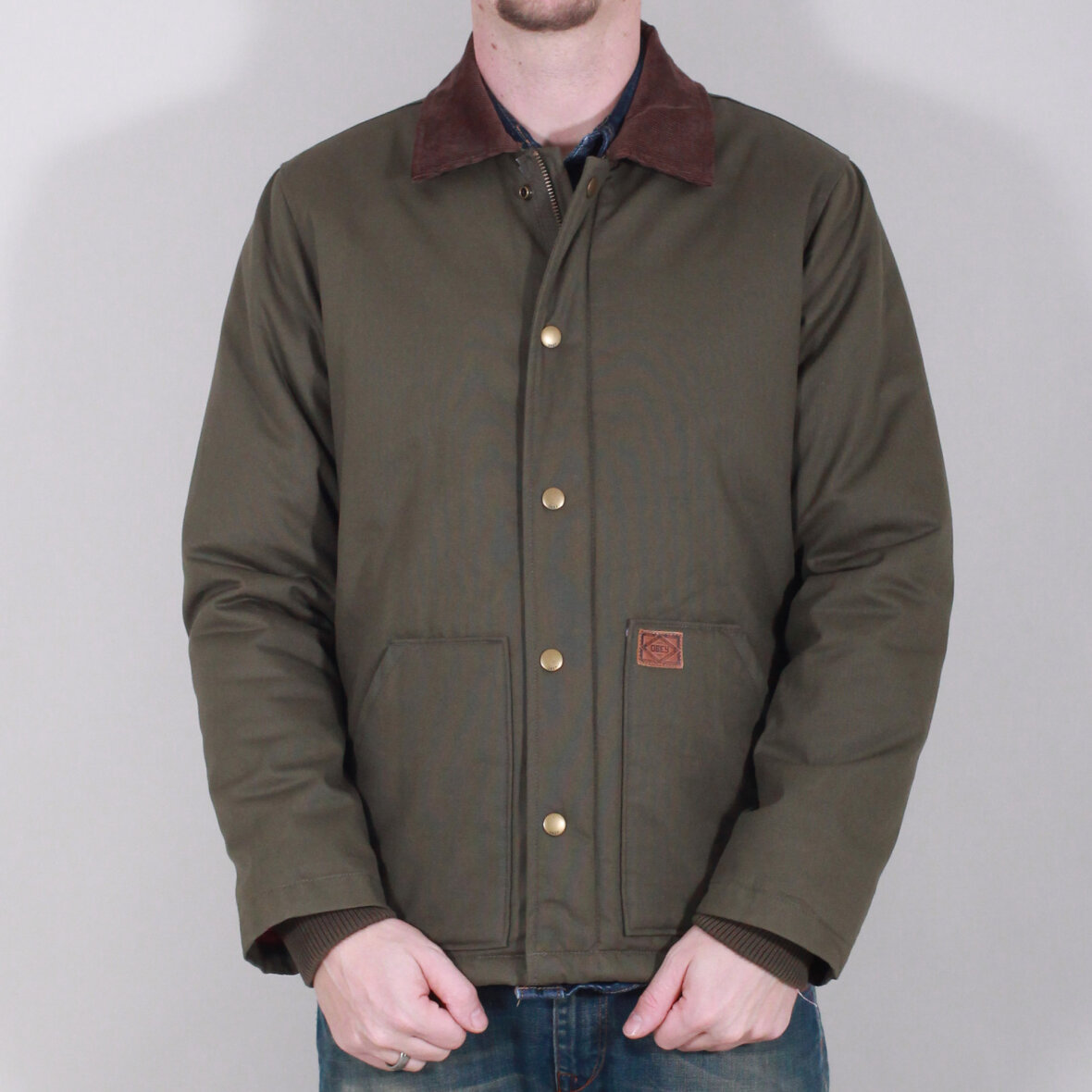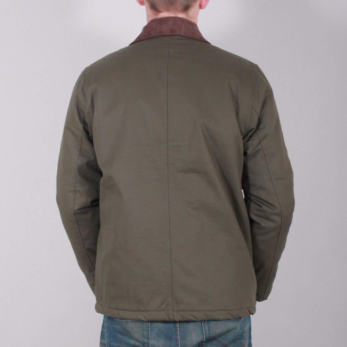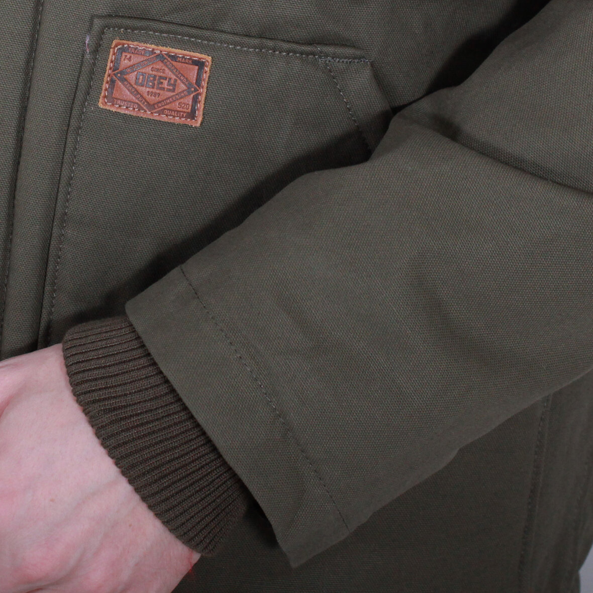 Kraftig kanvas jakke fra Obey. Med tryk knapper, fløjl krave og læder batch på den ene lomme.